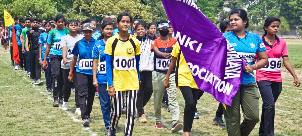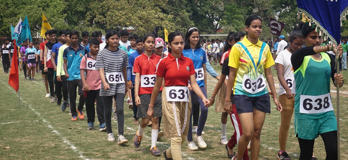 Participants take part in the march past of the annual athletics meet organised by the Athletic Association of Cuttack at the Satyabrata Stadium