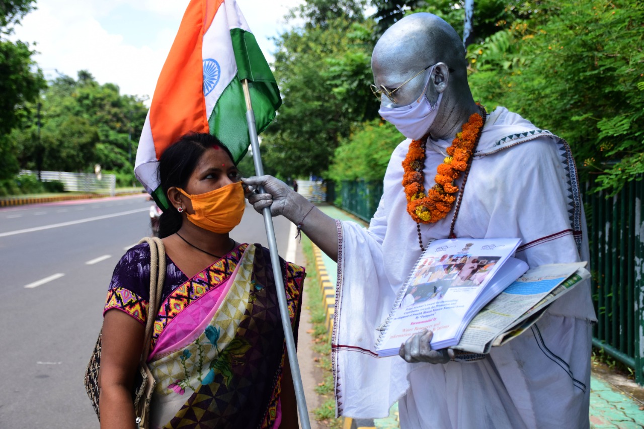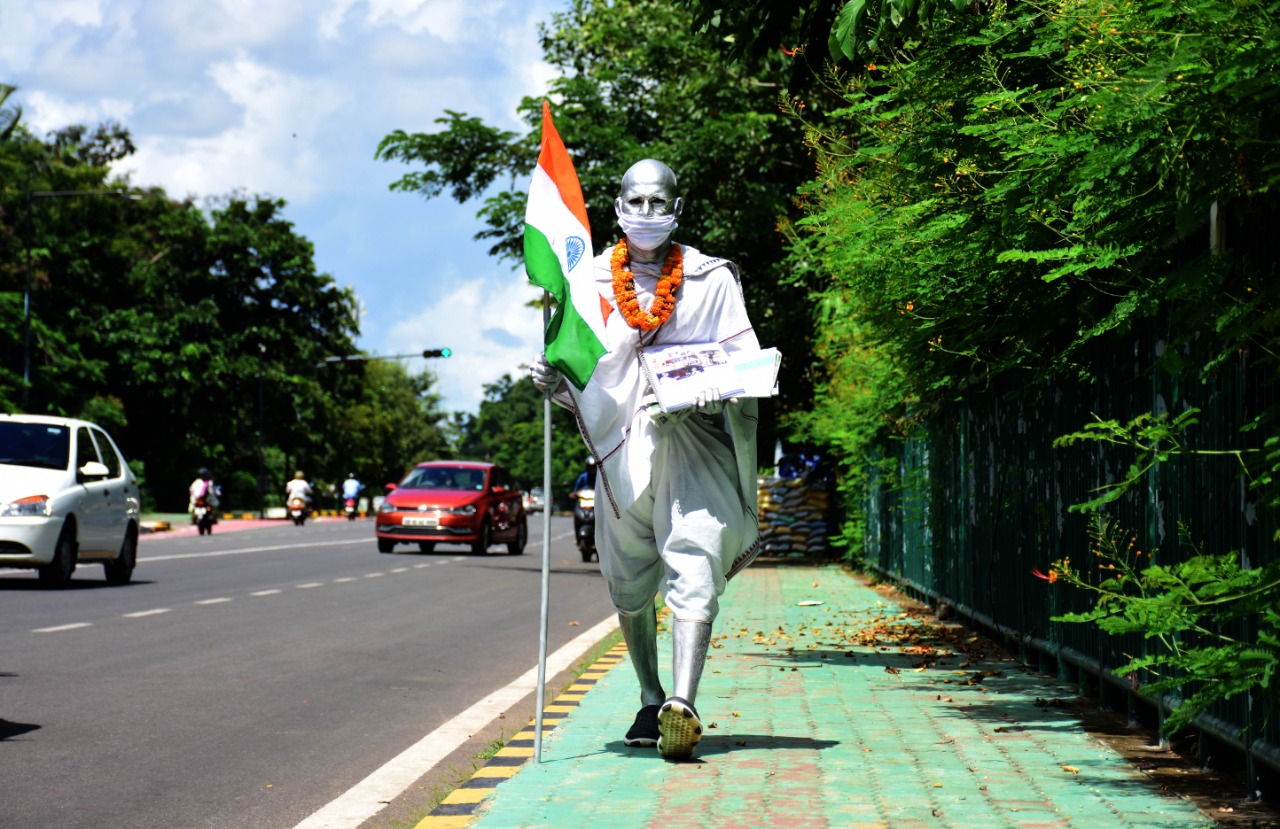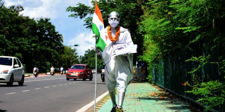 Donning Gandhi attire, a student of Utkal Sangeet Mahavidyalaya spreads awareness on wearing face mask at Sachivalaya Marg in Bhubaneswar, Monday