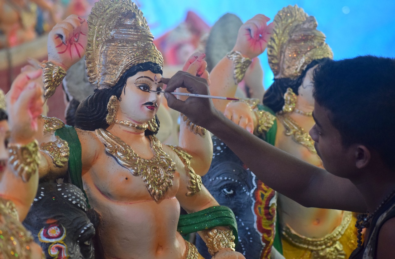 An artisan gives finishing touches to clay idols of Lord Bishwakarma in Old Town area of Bhubaneswar, Monday. Bishwakarma Puja which falls this Wednesday will be a low key affair, thanks to COVID-19