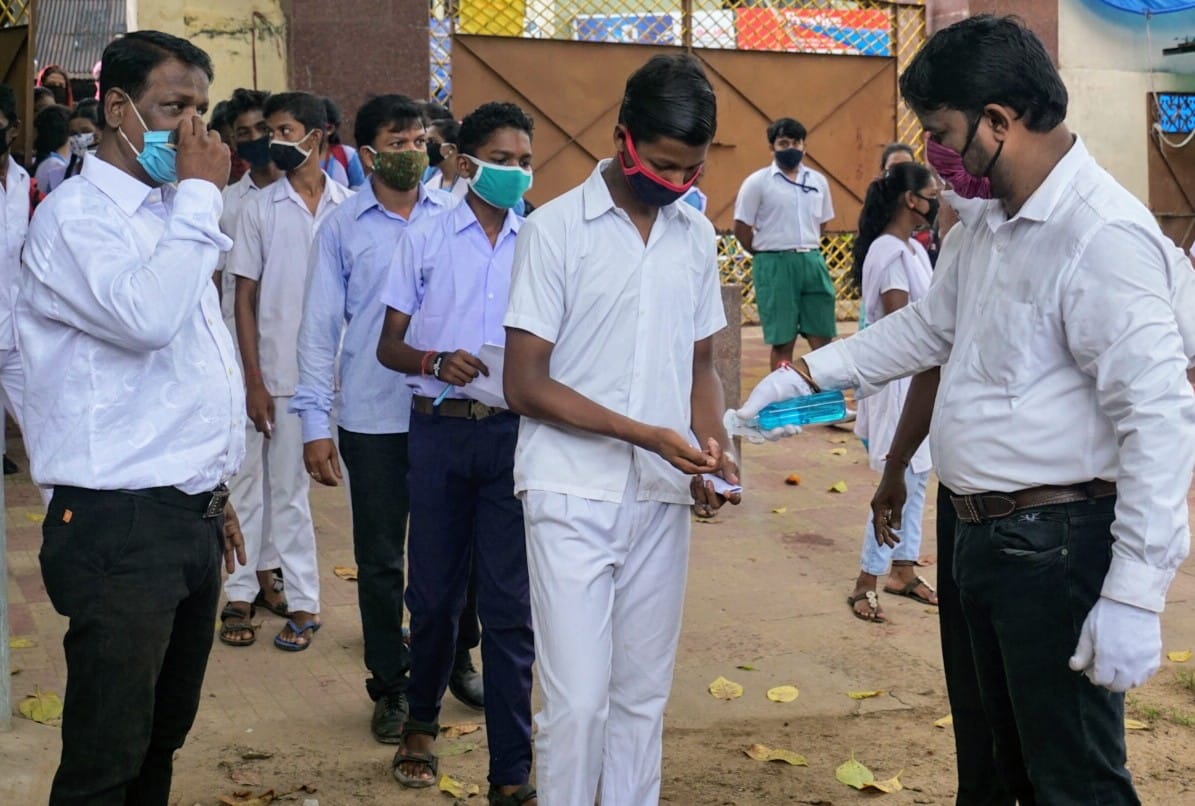 HSCE supplementary examinees enter exam halls at Ranihat High School in Cuttack, Monday