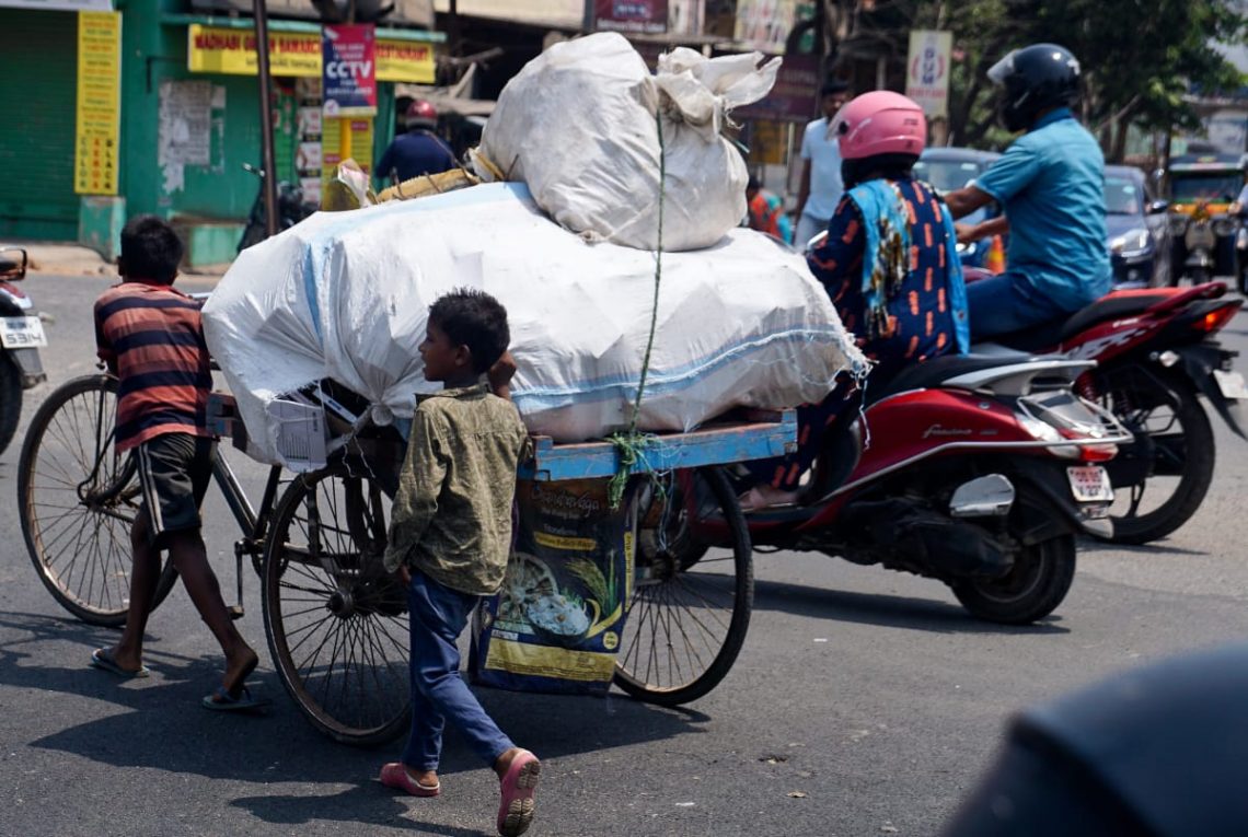 Two minor boys pulling a trolley cart in a crowded street close to Sati Chaura Square in  Cuttack