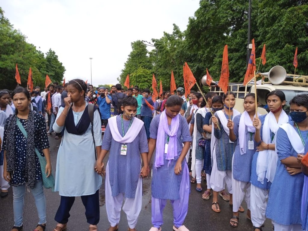 Members of ABVP stage a demonstration at PMG Square in Bhubaneswar condemning the recent ragging in BJB Autonomous College in the City and demanding stringent action against those involved in the heinous act