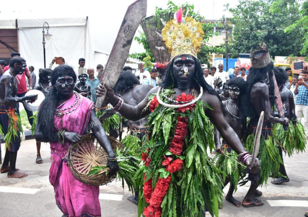 The Odisha unit of the Bharatiya Janata Party organised Monday a grand welcome for Union Home Minister Amit Shah in front of its office in the state capital with various tribal groups performing their acts