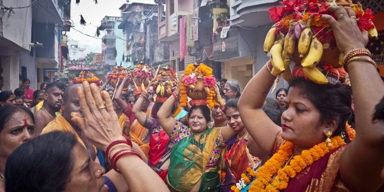 The Dewan Bazaar Tanti Sahi women led a sizable procession in the area, fervently worshipping the Solapua deity.