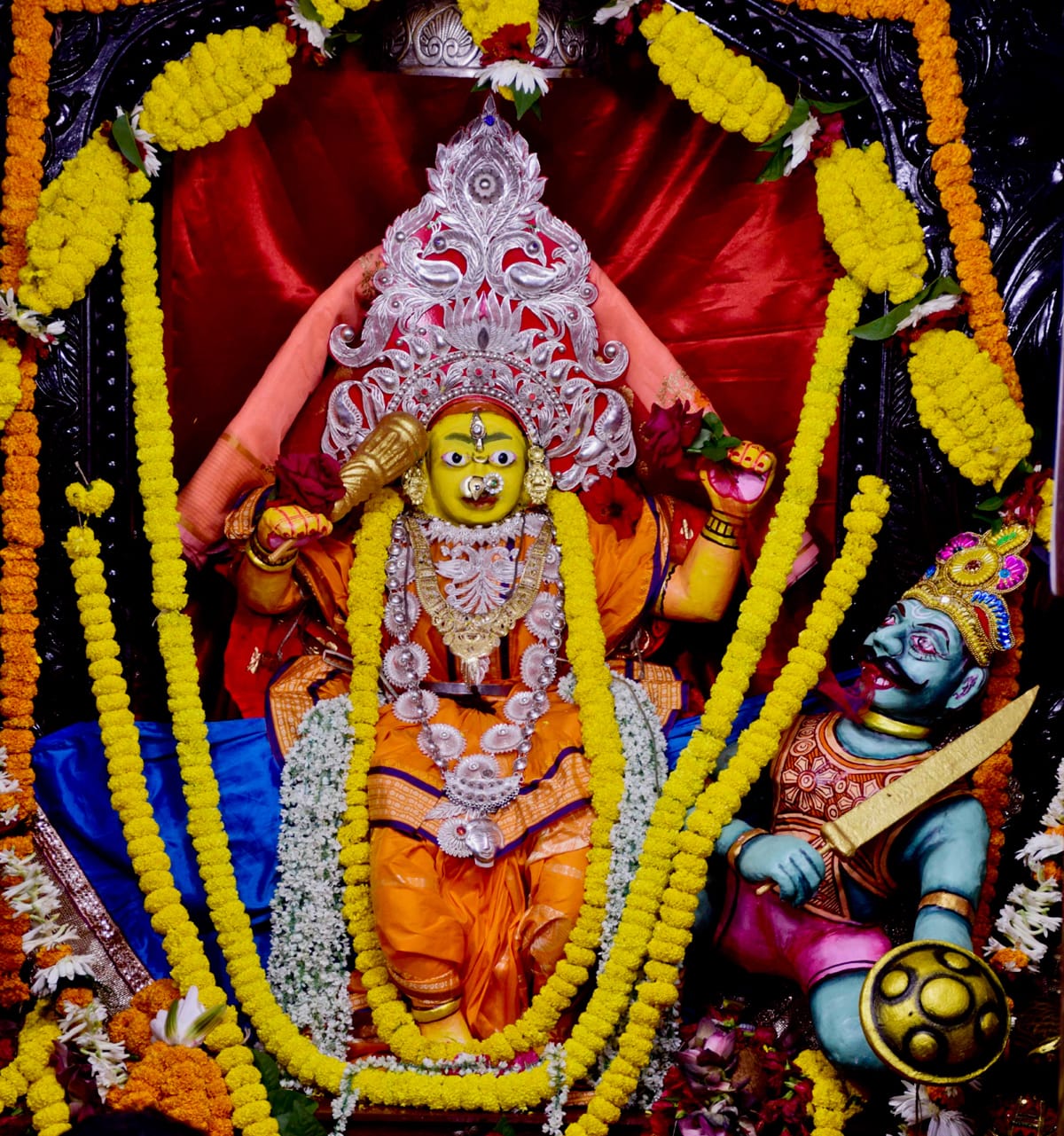 Goddess Jhanjirimangala dressed in Jai Durga attire at a temple in Cuttack
