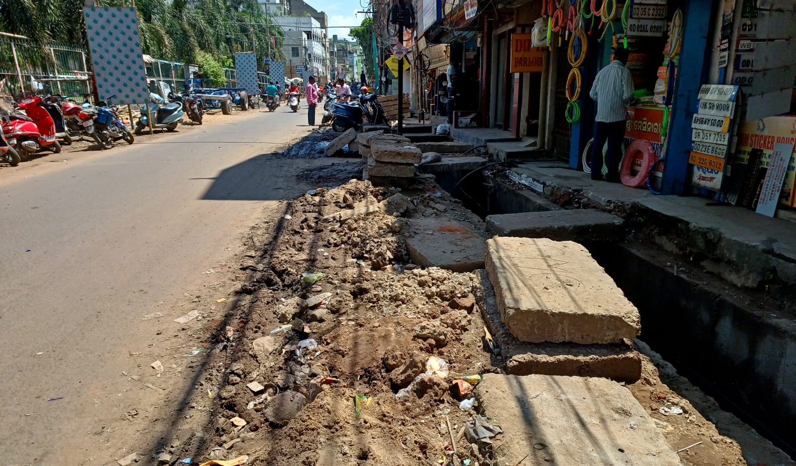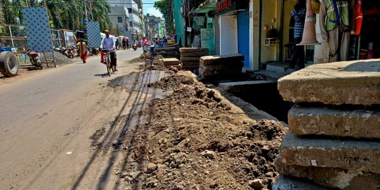 Despite Durga Puja on the anvil, work for repairing the Cuttack-Nuapatna main road is progressing at a slow pace.