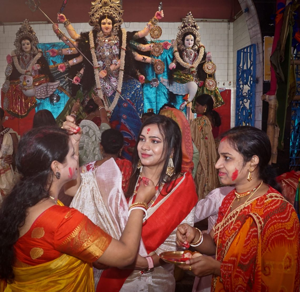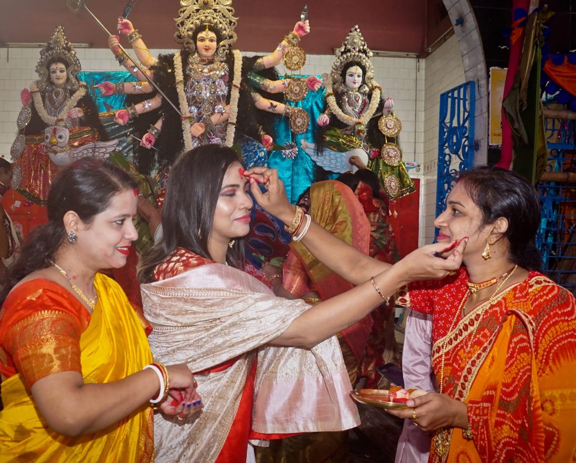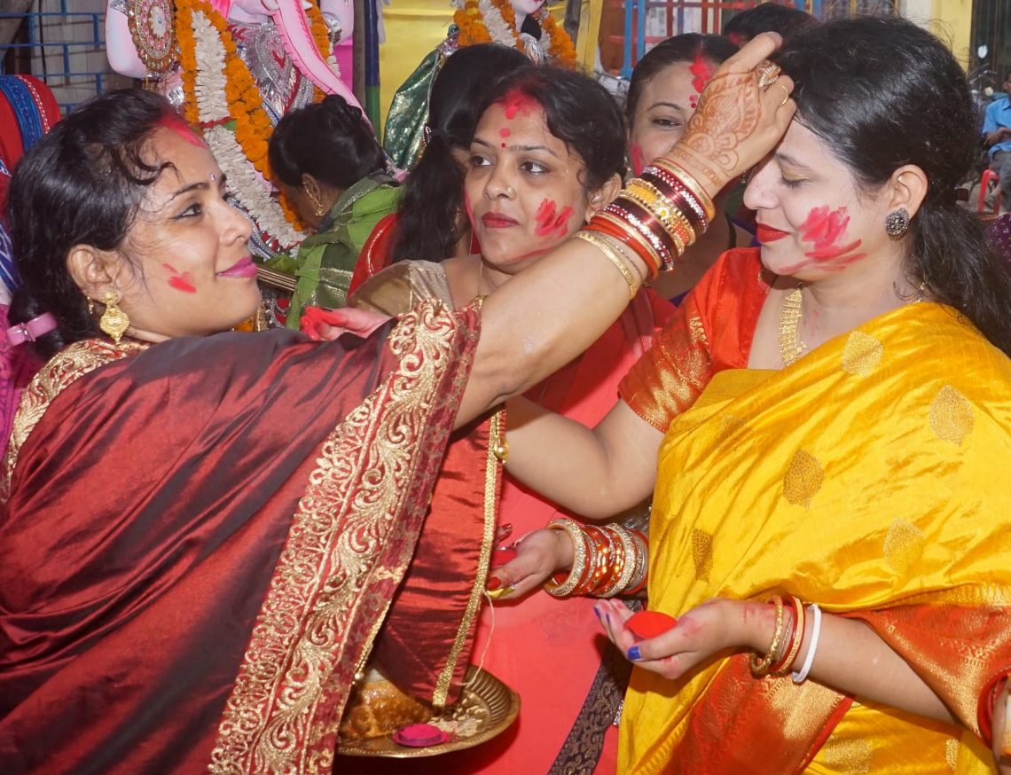 Women participate in ‘Sindura Khela’ at Mehendipeer Colony Durga Puja pandal in Cuttack