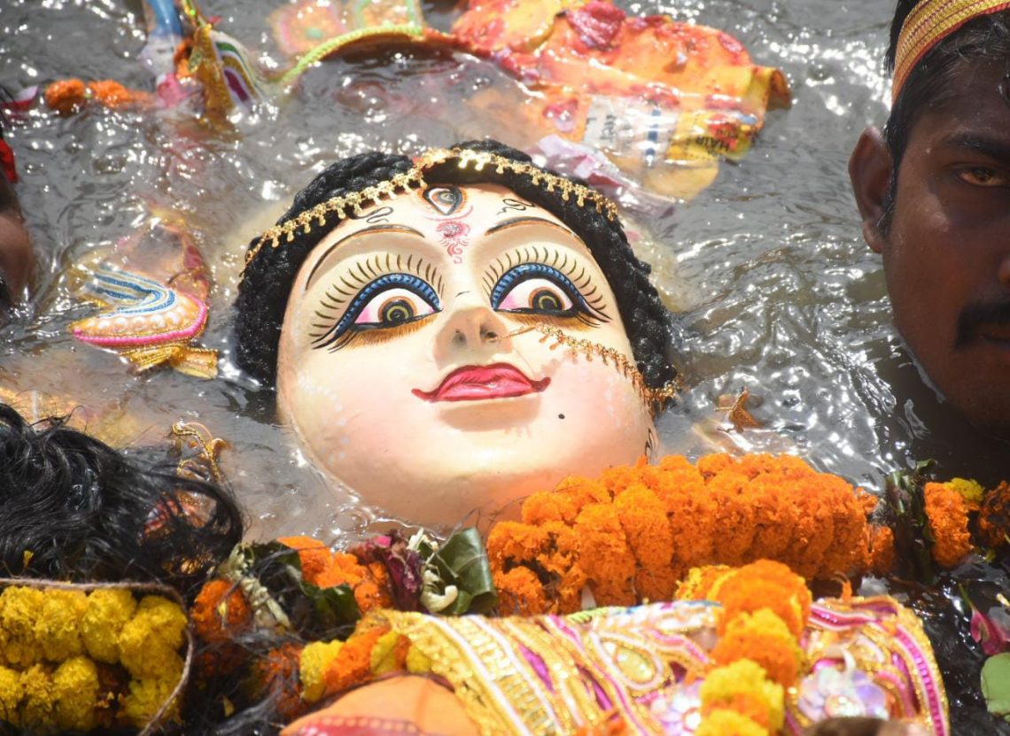Clay idols of Goddess Durga immersed at a temporary pond at Kuakhai riverbank in Bhubaneswar