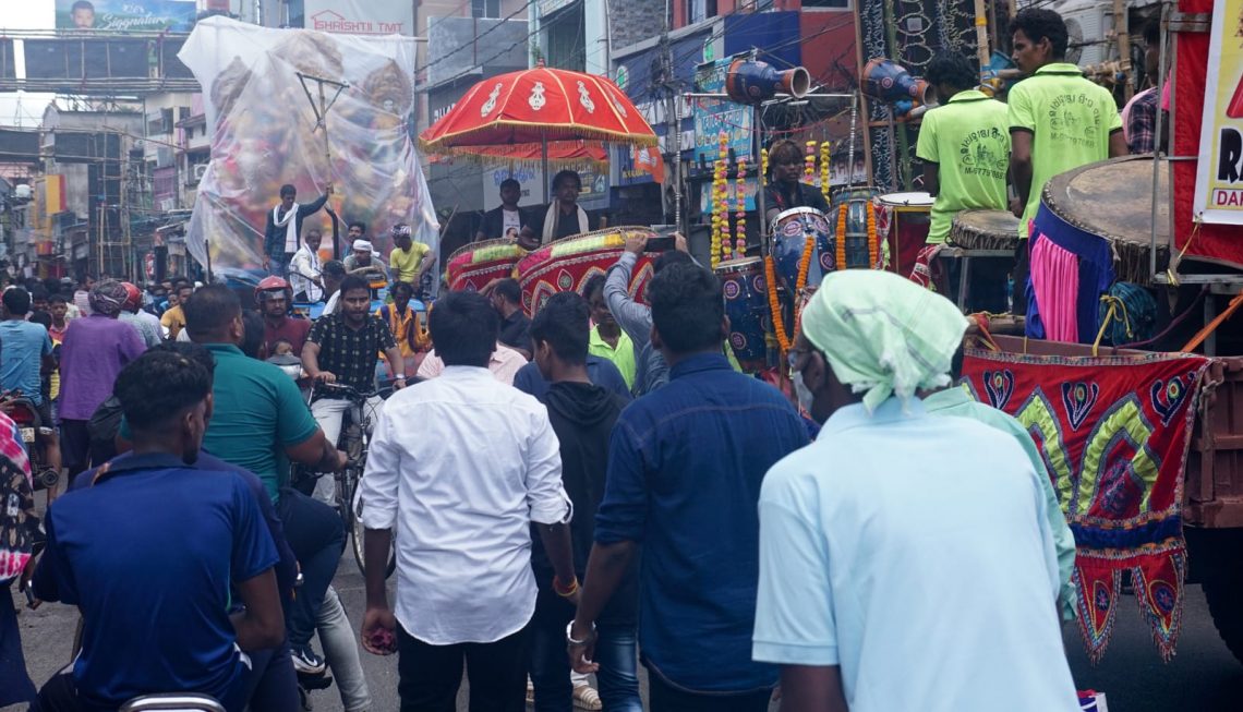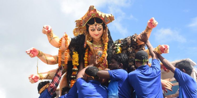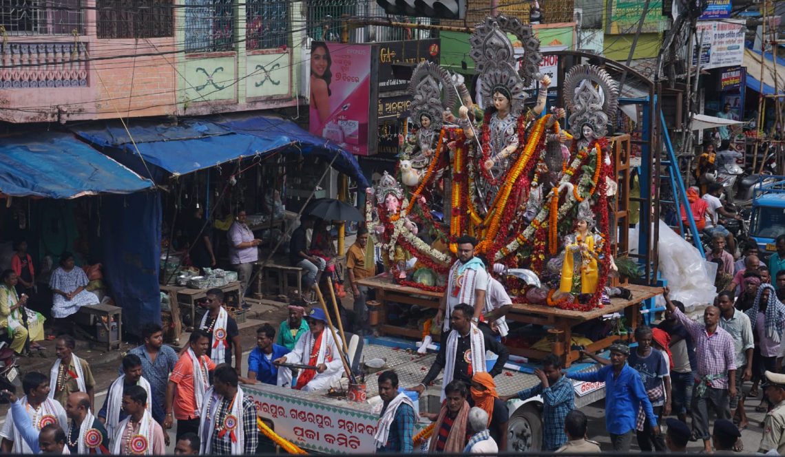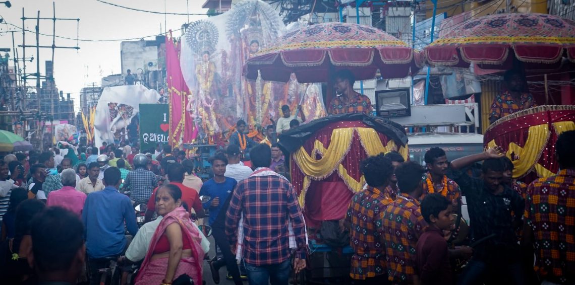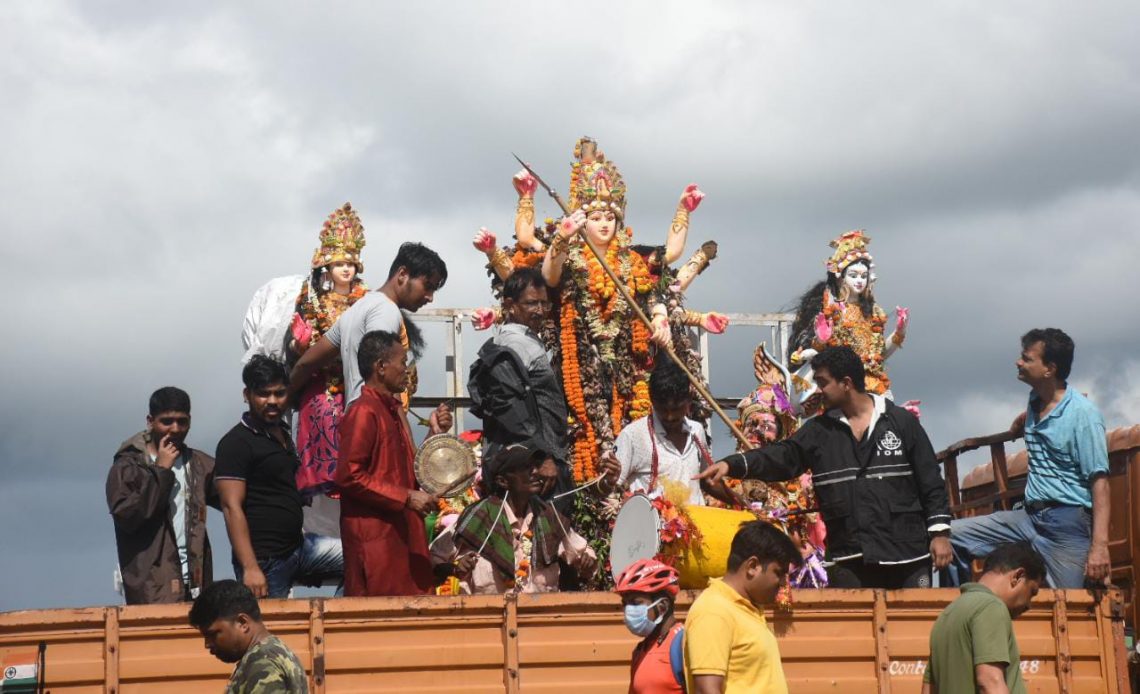 Idols of Goddess Durga being taken in a procession to Purighat Devigada on Kathajodi riverbank in Cuttack for immersion ceremony