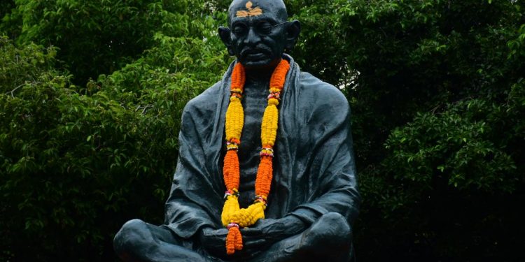 A man pays tribute to Mahatma Gandhi at Gandhi Park near Janata Maidan in Bhubaneswar