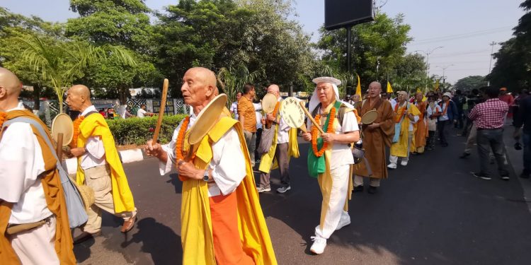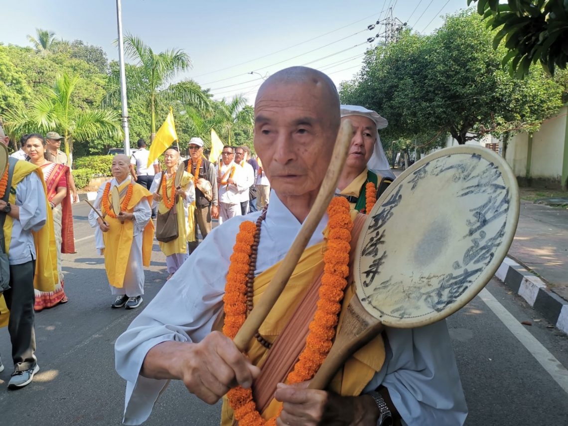Buddhist monks from US, Ukraine and Japan participate in Peace March from Bhubaneswar circuit house to Dhauli to mark golden jubilee celebration of the peace pagoda