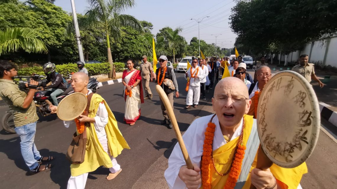 Buddhist monks from US, Ukraine and Japan participate in Peace March from Bhubaneswar circuit house to Dhauli to mark golden jubilee celebration of the peace pagoda
