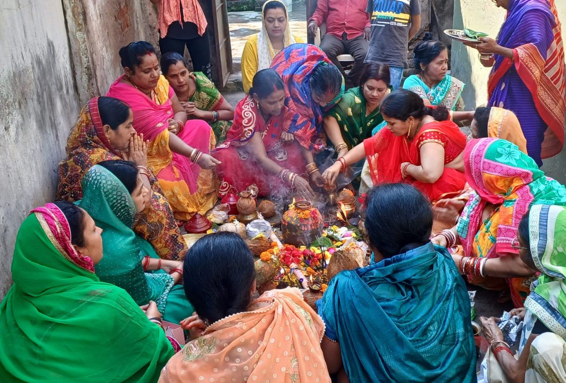 Female members of Bihari community perform Girigovardhan puja in Mehndi Peer area, Cuttack