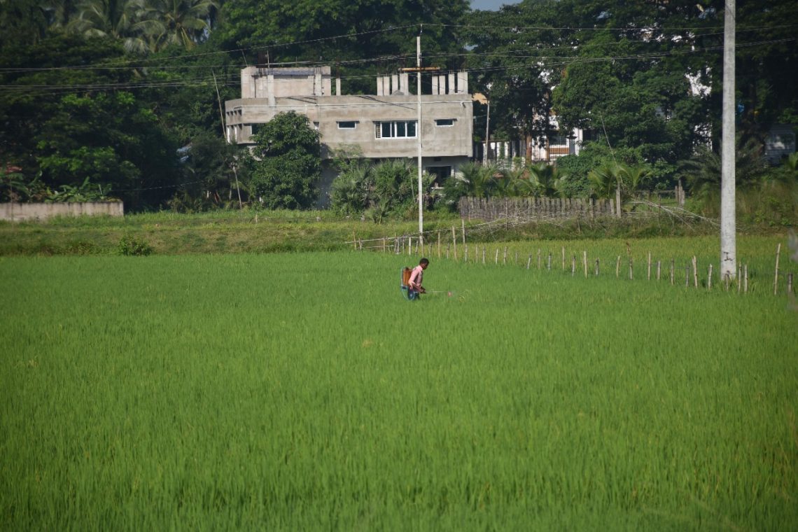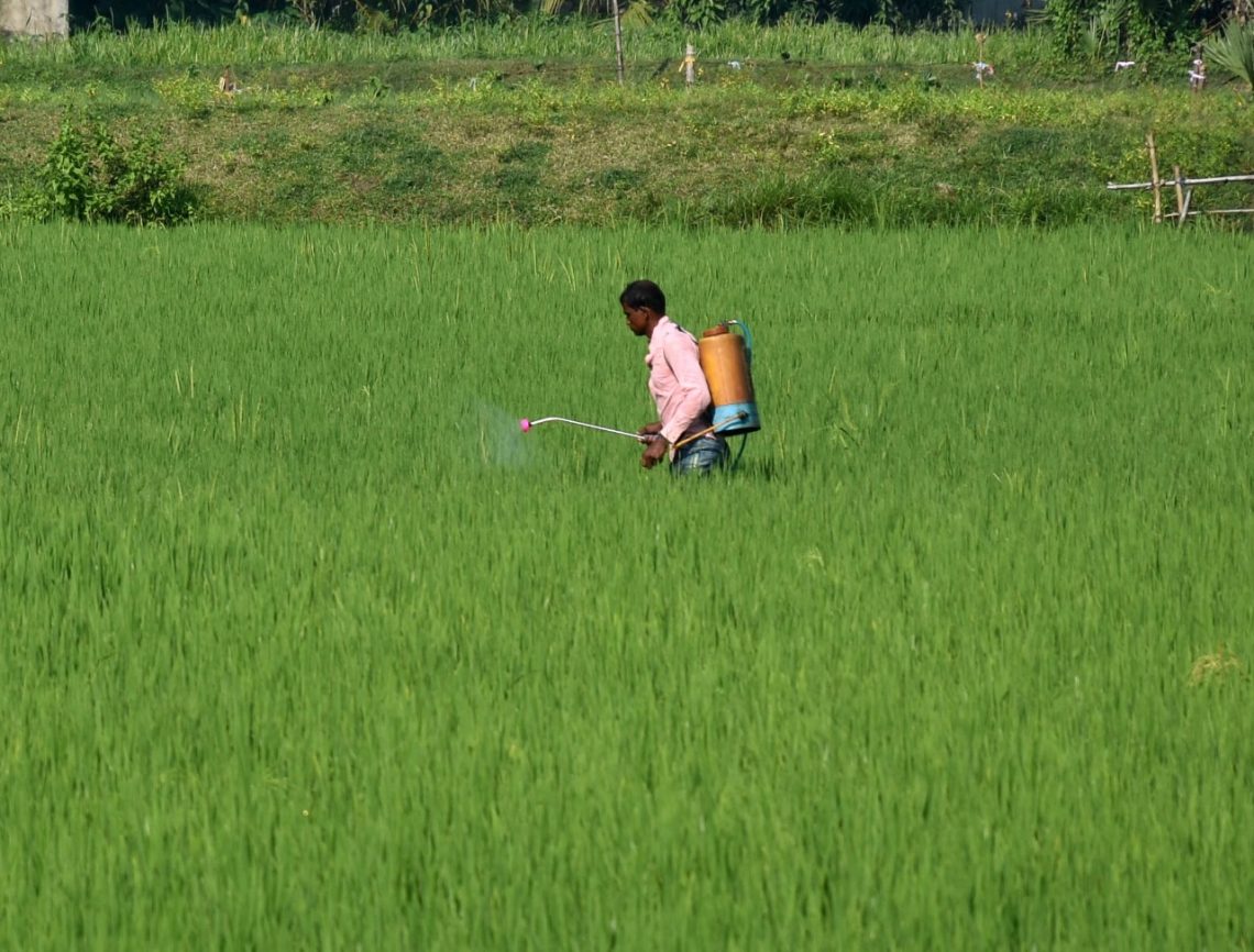 A man sprays pesticide in his field at Pipli bypass near Bhubaneswar