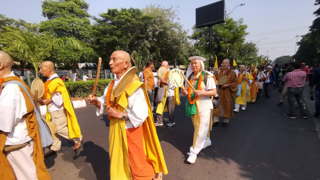 Buddhist monks from US, Ukraine and Japan participate in Peace March from Bhubaneswar circuit house to Dhauli to mark golden jubilee celebration of the peace pagoda