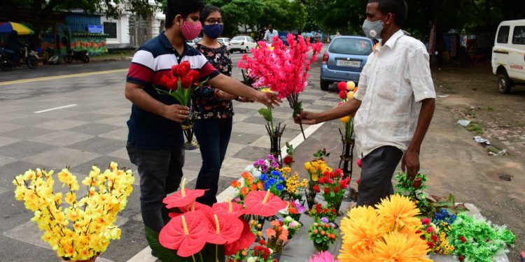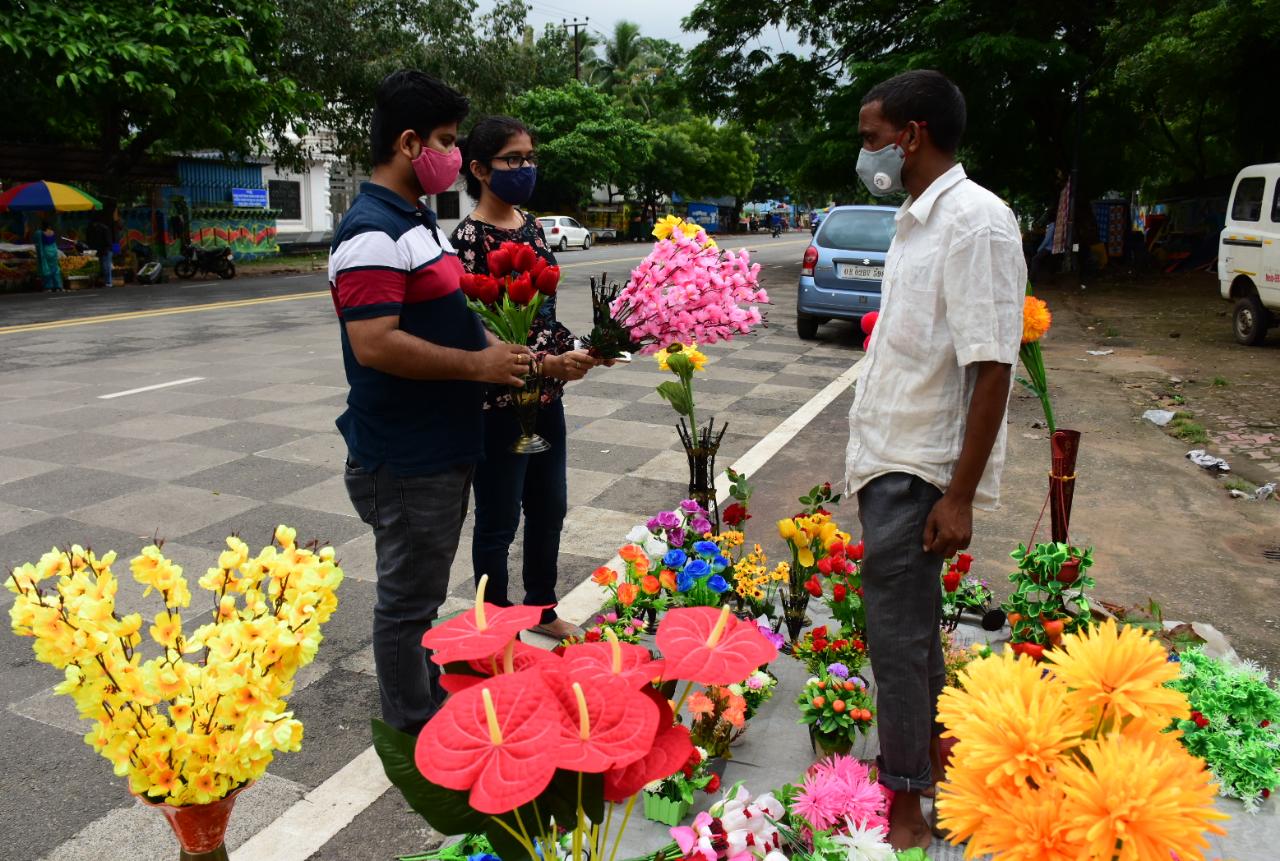 A street vendor sells artificial flowers near Exhibition Field in Bhubaneswar