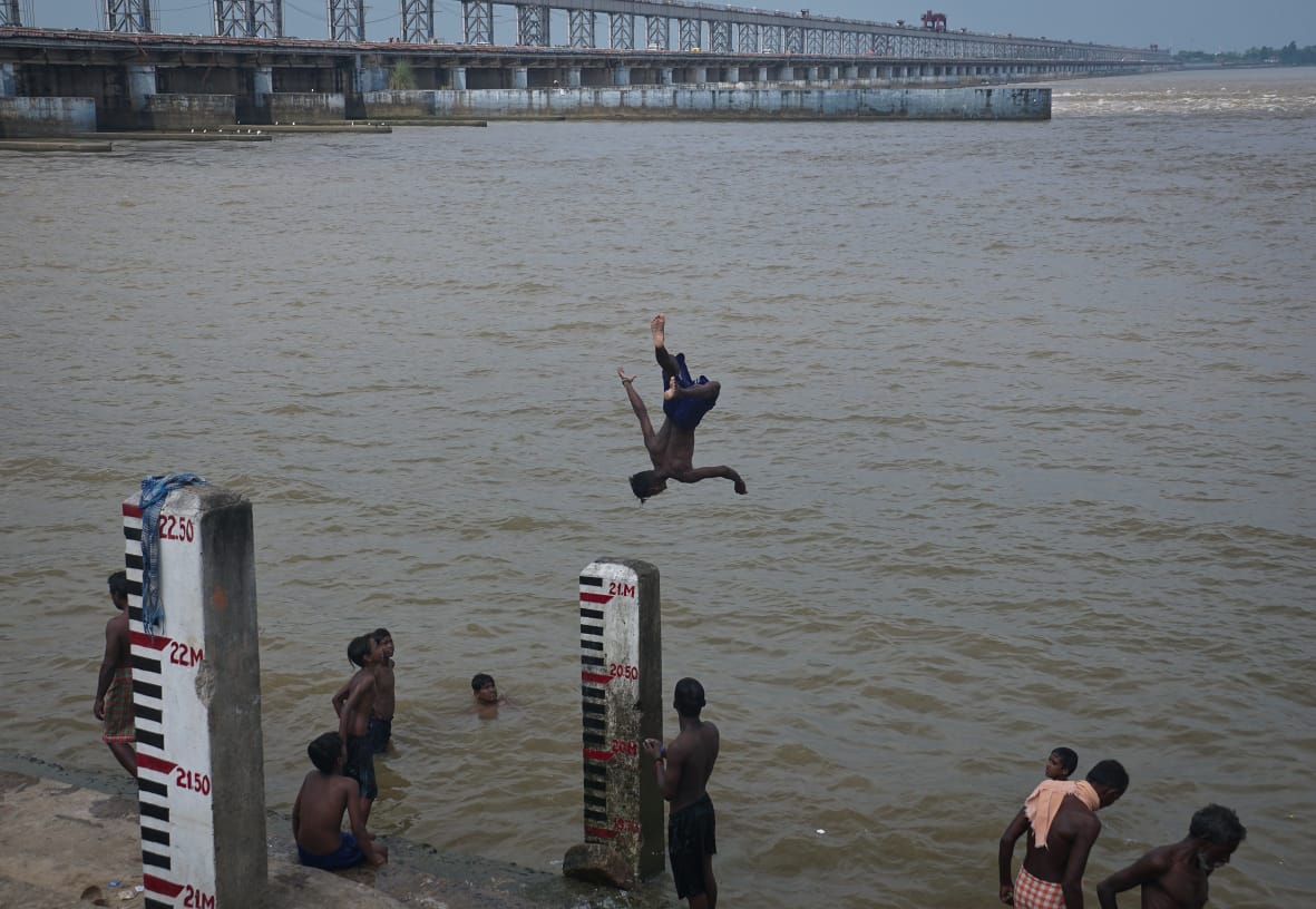 A young man jumps into Mahanadi waters at Jobra anicut in Cuttack