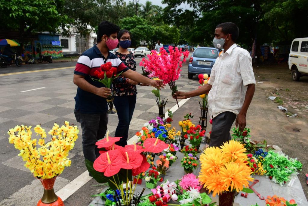 A street vendor sells artificial flowers near Exhibition Field in Bhubaneswar