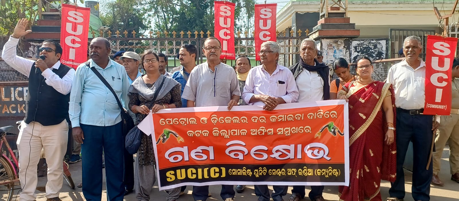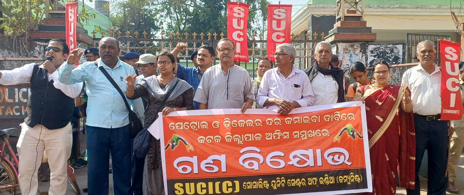SUCI(C) members protest in front of Cuttack collector’s office demanding reduction in petrol, diesel prices