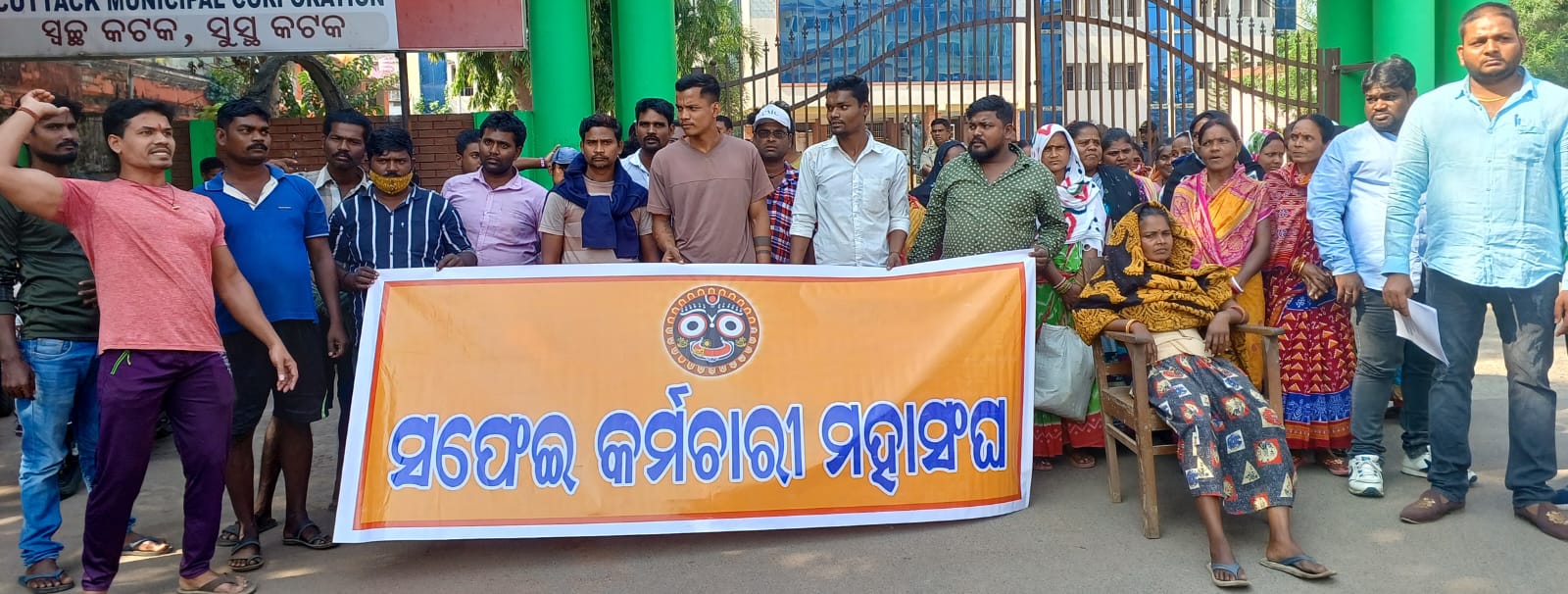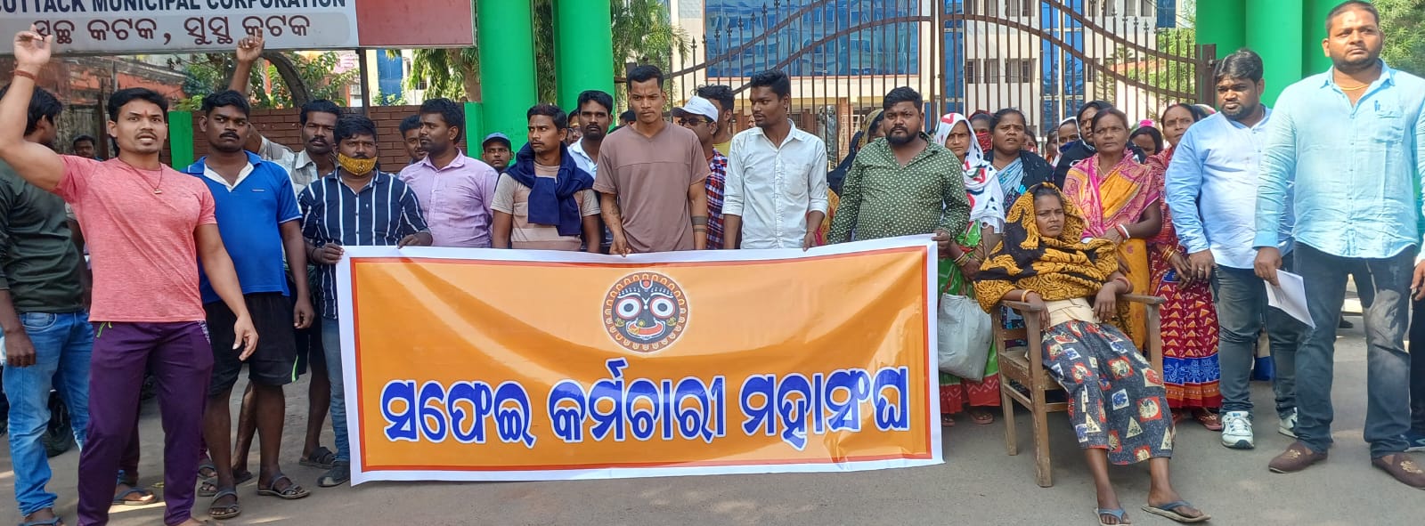 Members of Safei Karmachari Mahasangha protest in front of CMC office in Cuttack demanding compensation for a colleague who was injured on job