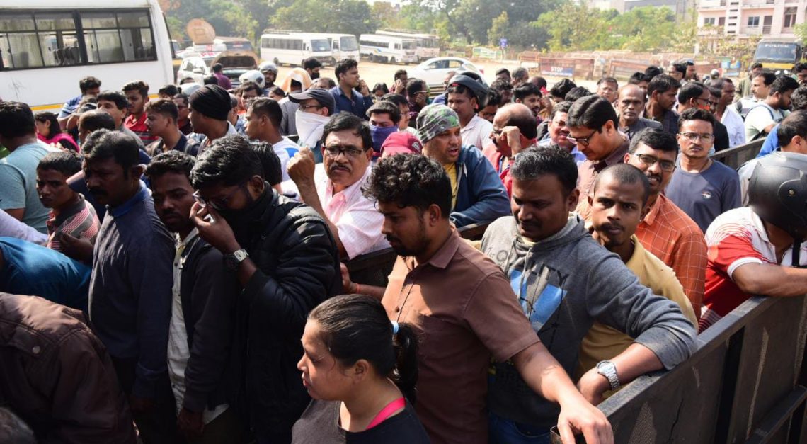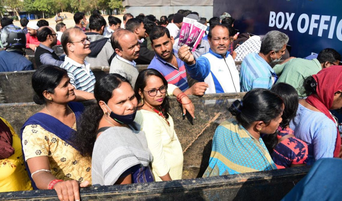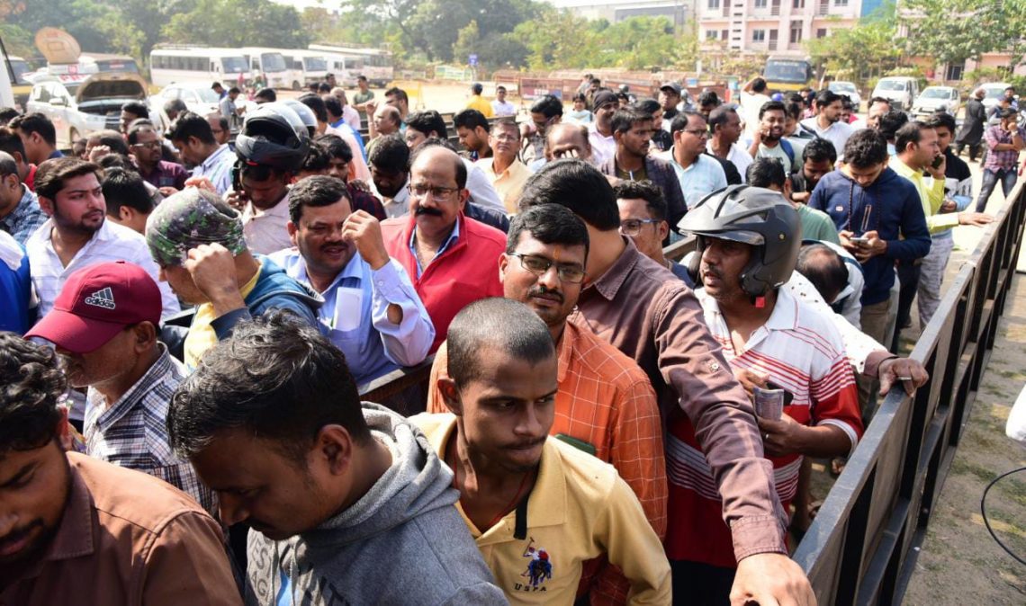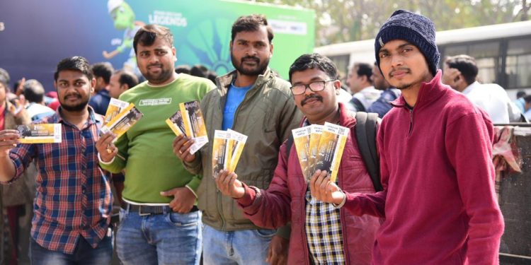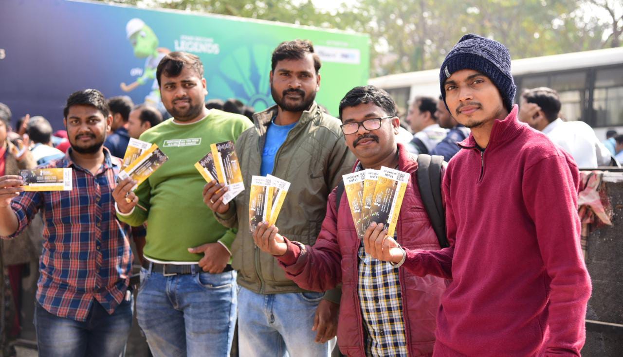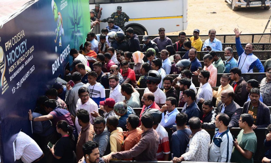Fans queue up in huge numbers to buy tickets for the FIH Men’s Hockey World Cup near gate number 8 at the Kalinga Stadium in Bhubaneswar