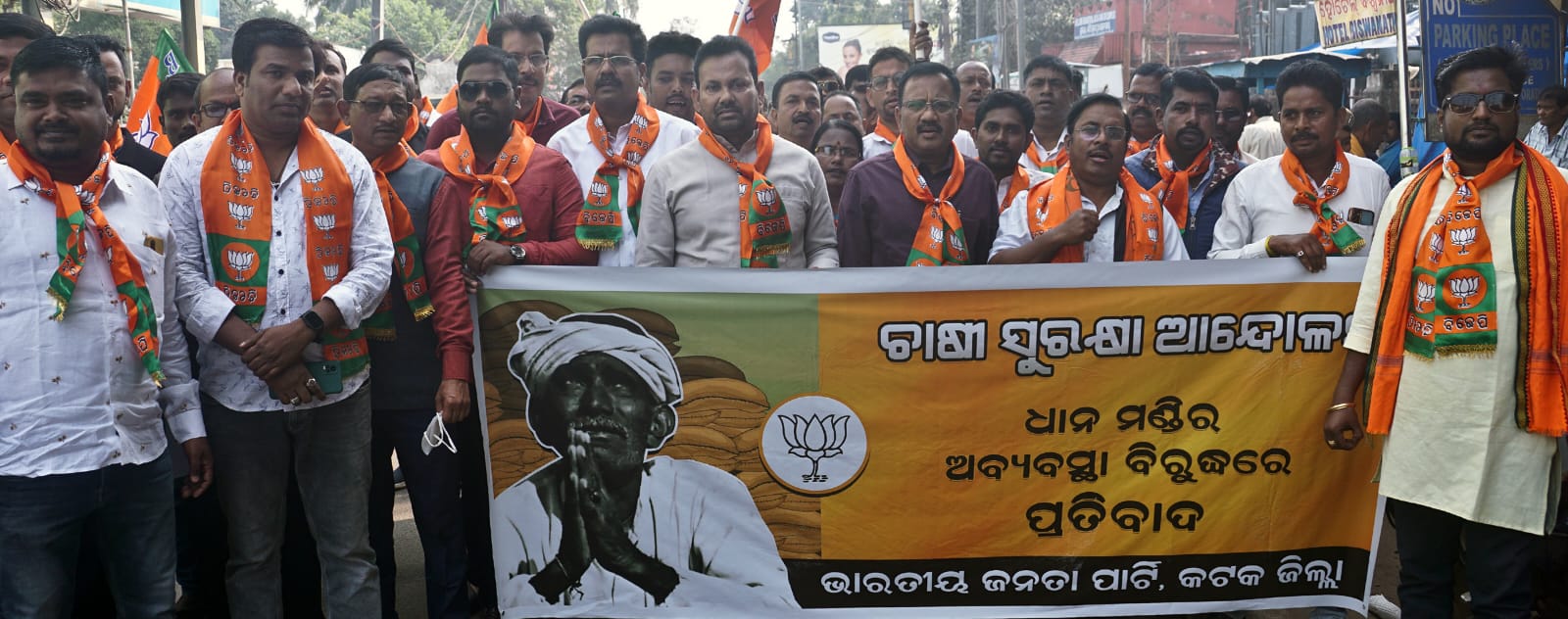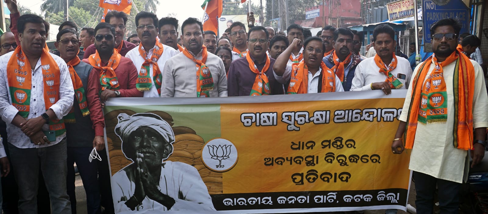 BJP workers protest in front of Cuttack Sadar sub-collector office alleging irregularities in paddy procurement