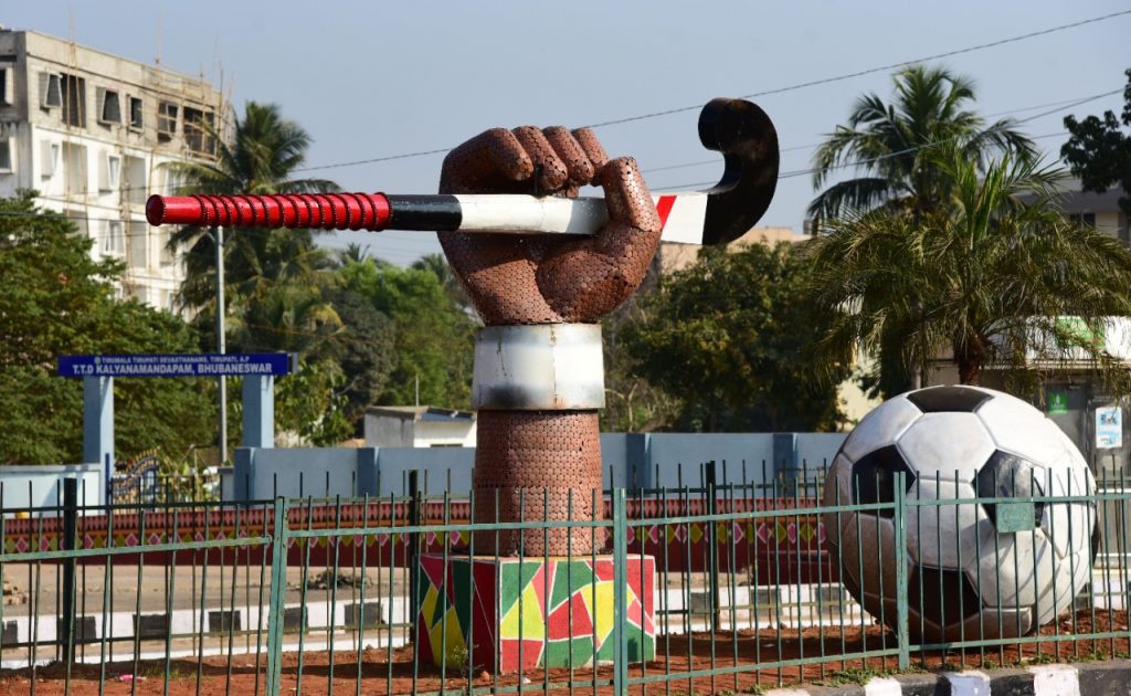 Youngsters take selfies in front of a statue depicting a football and a hockey stick at Jayadev Vihar, Bhubaneswar