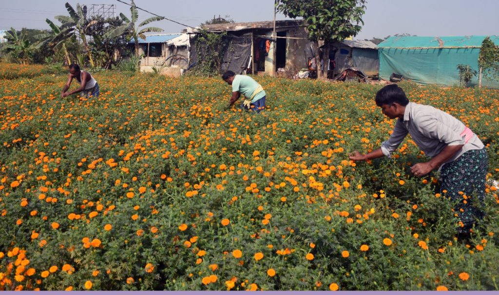 Farmers harvest marigold from a field near Daya river on Bhubaneswar outskirts