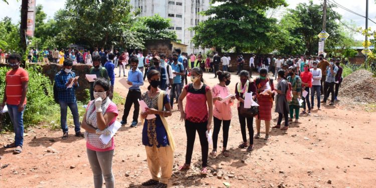 OJEE aspirants enter an examination centre in Chandrasekharpur area of Bhubaneswar, Monday
