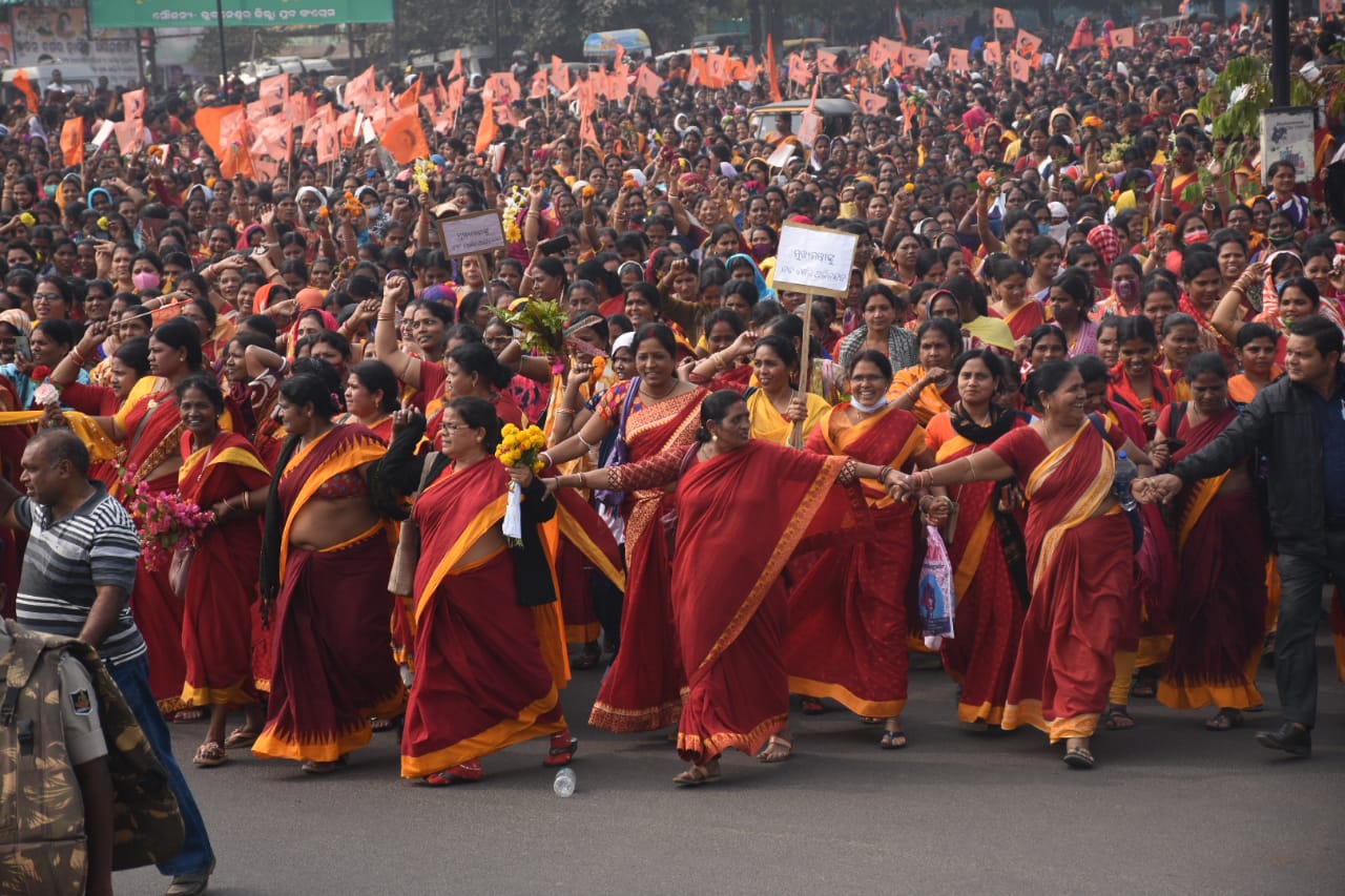 Members of All Odisha Anganwadi Ladies Workers’ Association take out a rally from PMG Square to Naveen Nivas in Bhubaneswar; cops stop the rally at Rajmahal square