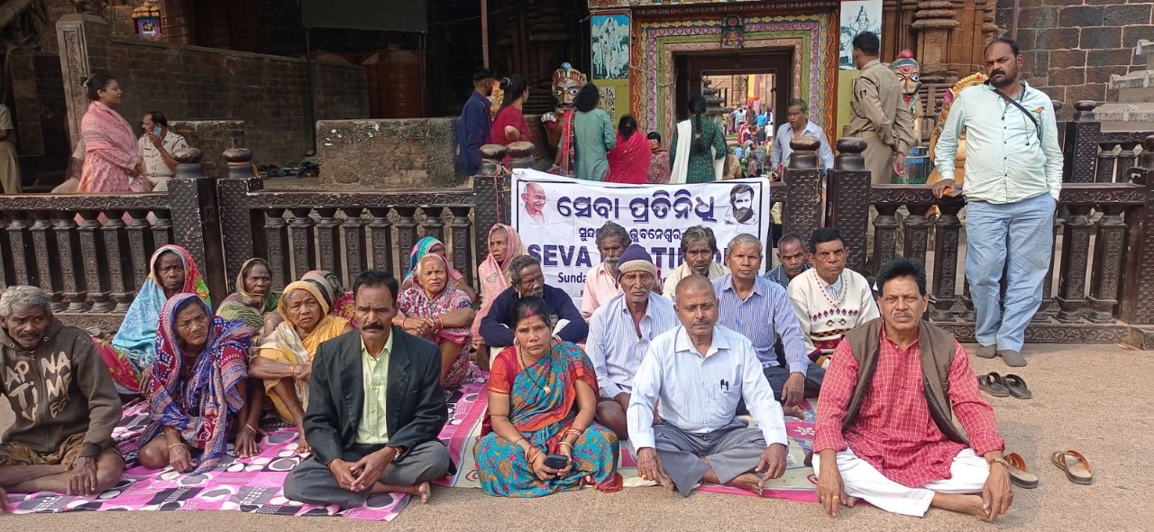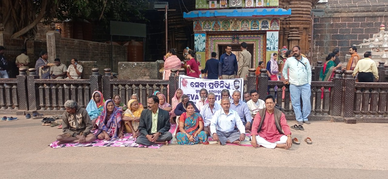 Members of Seva Pratinidhi demonstrate in front of Lingaraj temple in Bhubaneswar protesting against stoppage of rituals by servitors