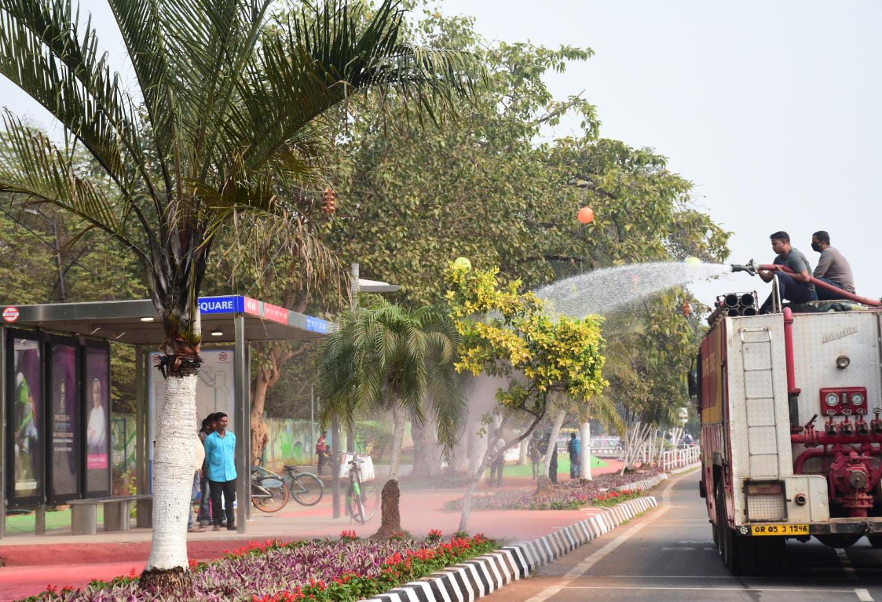 Fire services personnel clean streets in Bhubaneswar ahead of Hockey World Cup