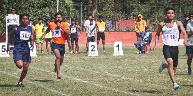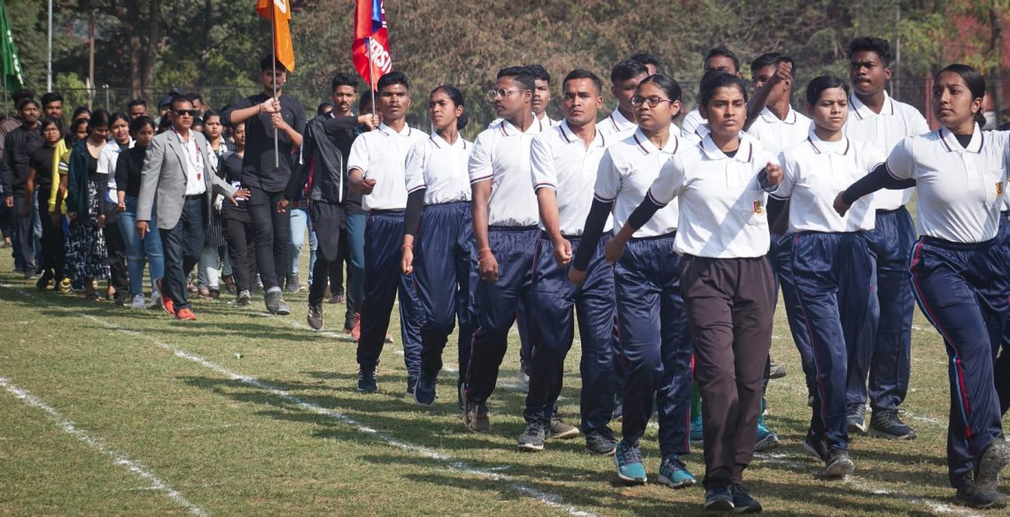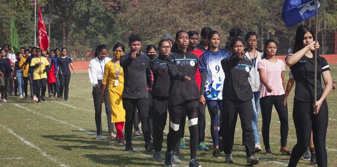 Students of Ravenshaw University take part in the march past ahead of the 16th Annual Athletics meet of the educational institution, Monday