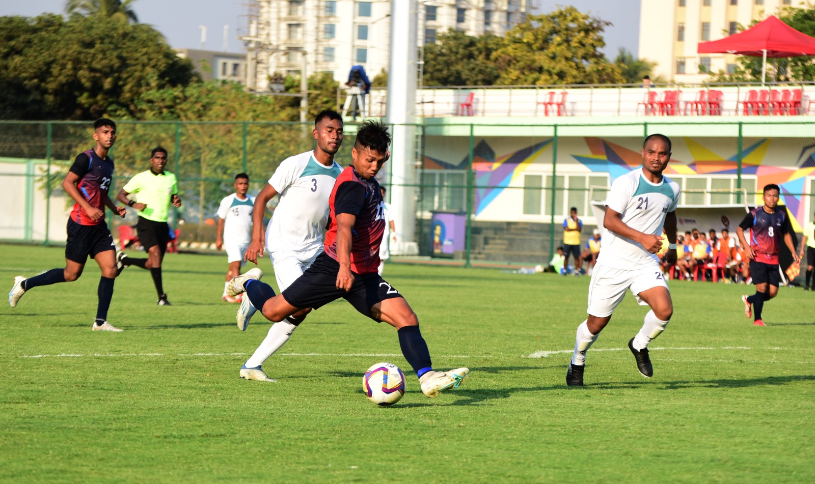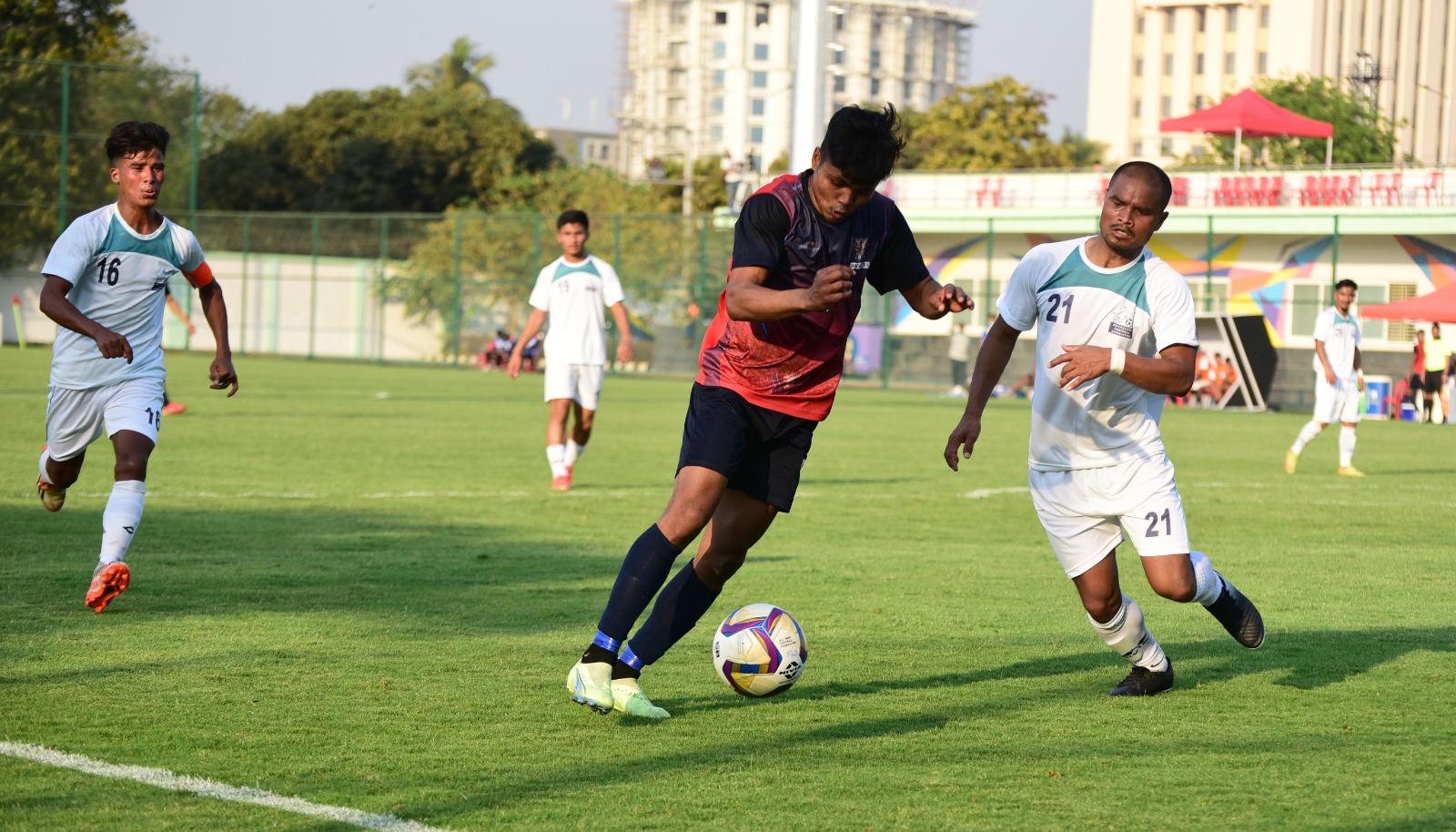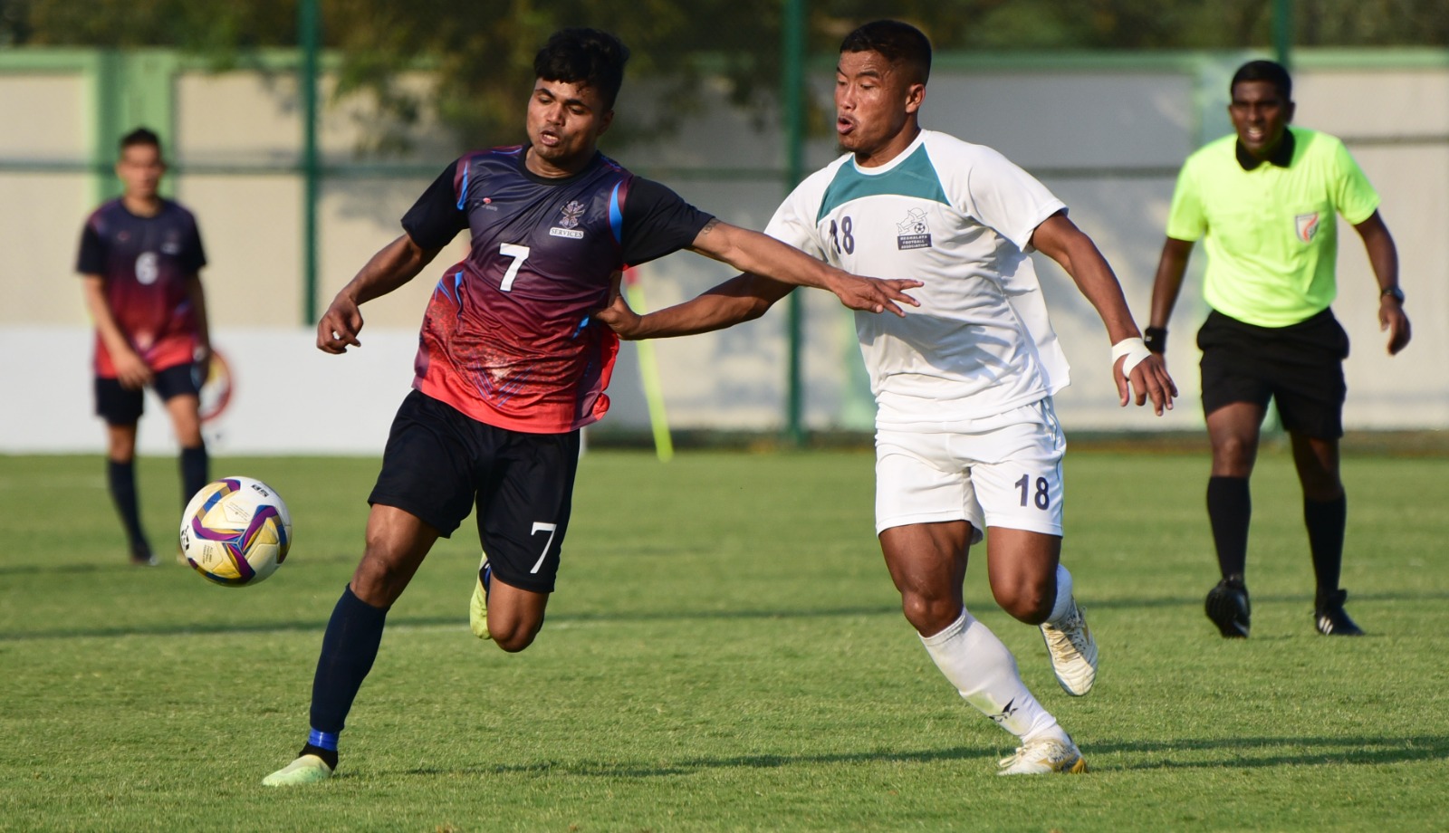 National Football Championship for Santosh Trophy: Players in action during match between Services football team and Meghalaya football team at Capital ground in Bhubaneswar