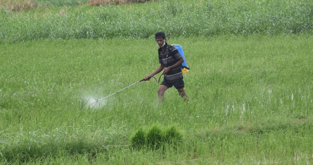 A farmer sprays pesticides in a paddy field at Bhubaneswar OUAT campus