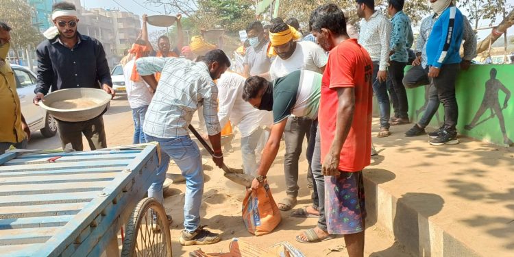 Members of Subhash Sangathan march towards CMC office carrying sand to protest against poor condition of Cuttack roads