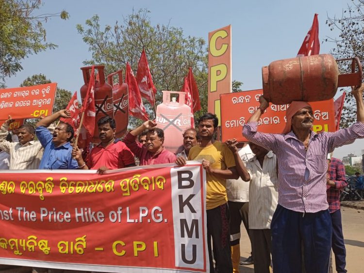 Left activists protest against LPG price hike at Rajmahal Square, Bhubaneswar