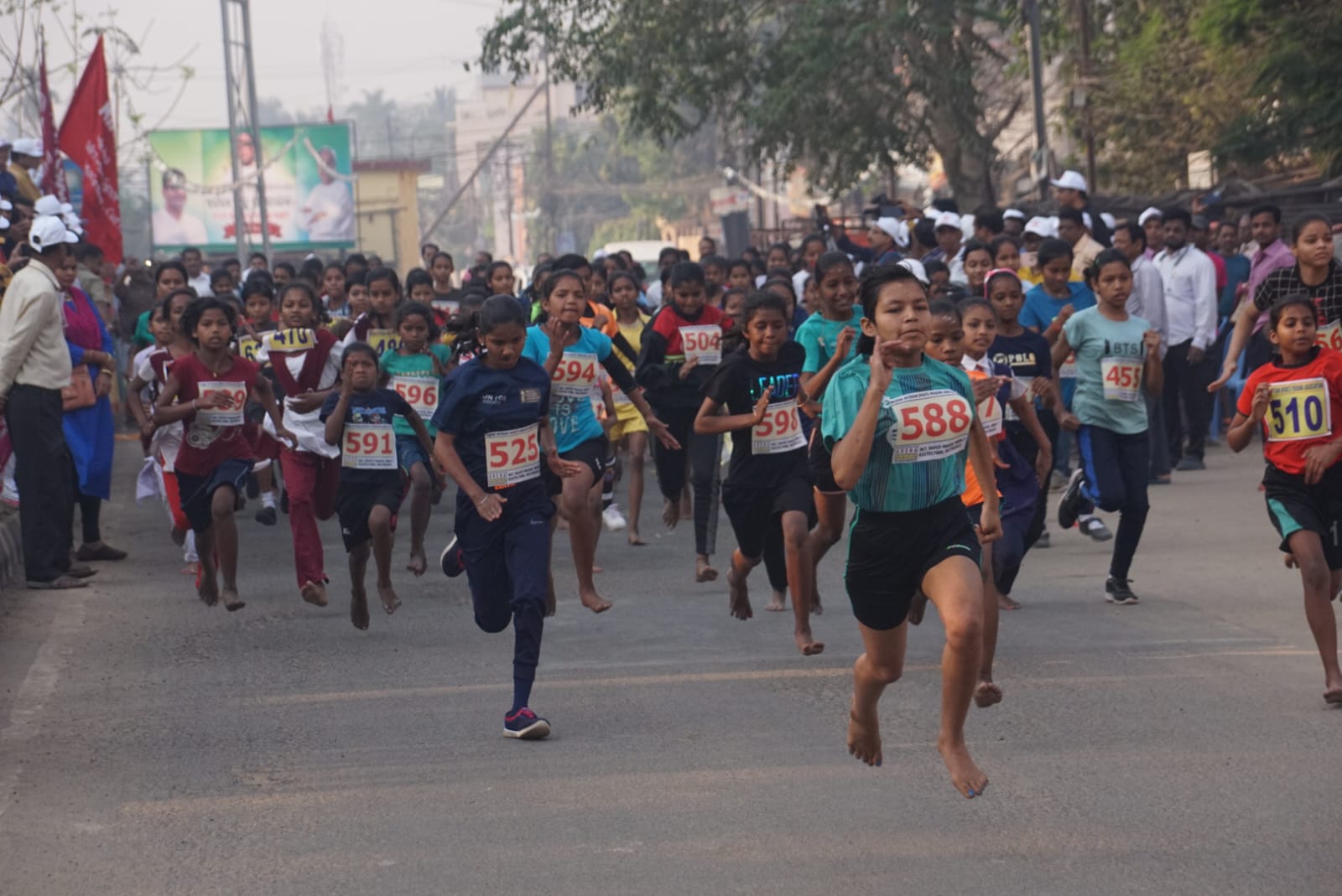 Children participate in a running event organised by Veteran Sportspersons Association in Cuttack on occasion of Biju Patnaik’s 107th birth anniversary