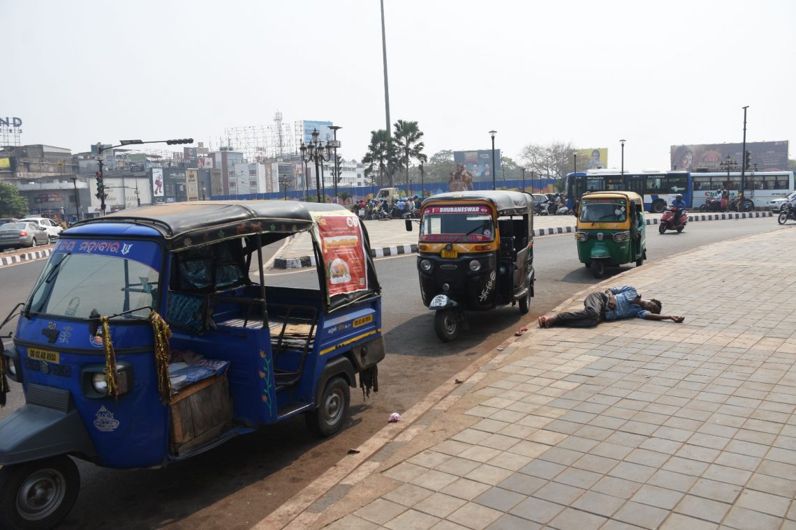 A drunkard passes out at Master Canteen Square in Bhubaneswar in mid-day sun