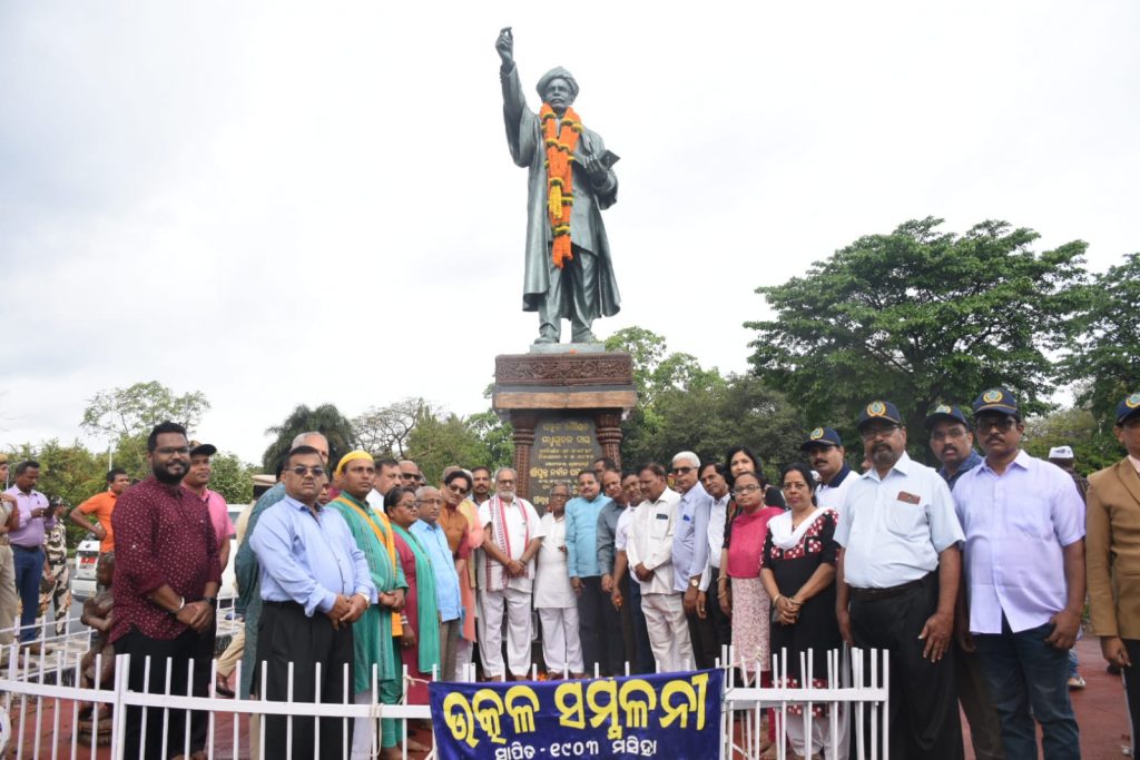 Members of Utkal Sammilani garland statue of Madhusudan Das near Raj Bhavan in Bhubaneswar