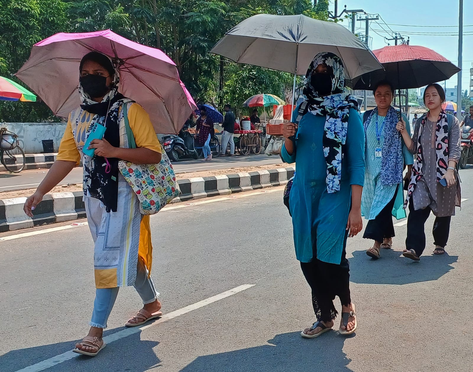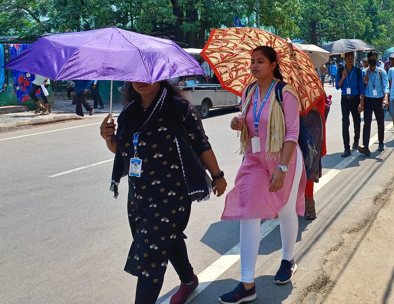 Students of SCB Medical College use umbrellas to protect themselves from scorching sun in Cuttack