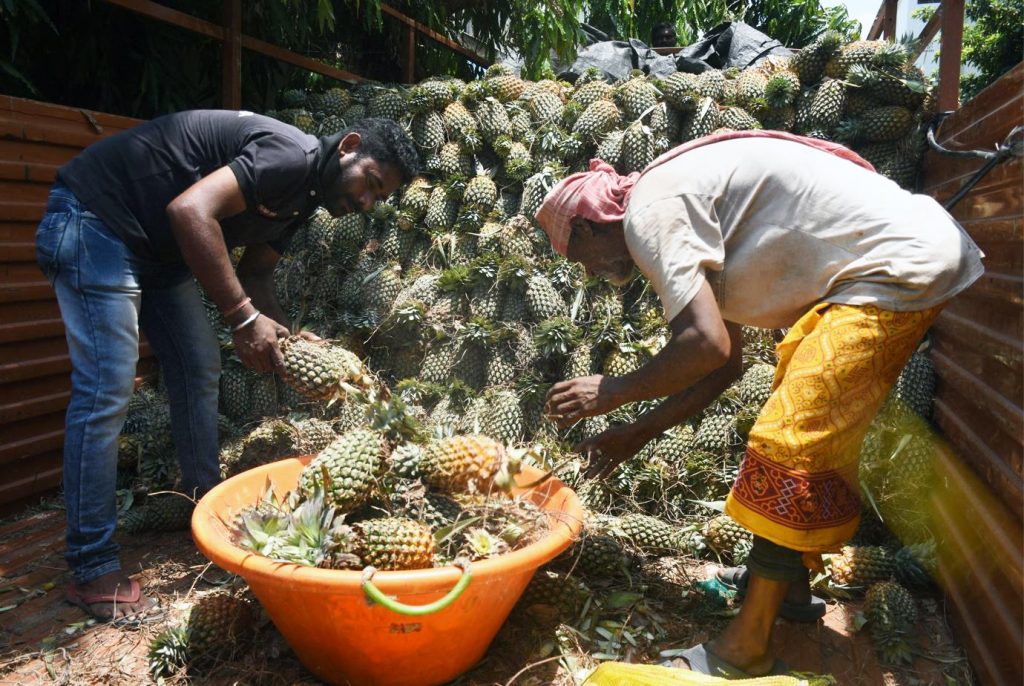 Pineapples brought from Kerala being unloaded from a truck at Ashok Nagar fruit market in Bhubaneswar