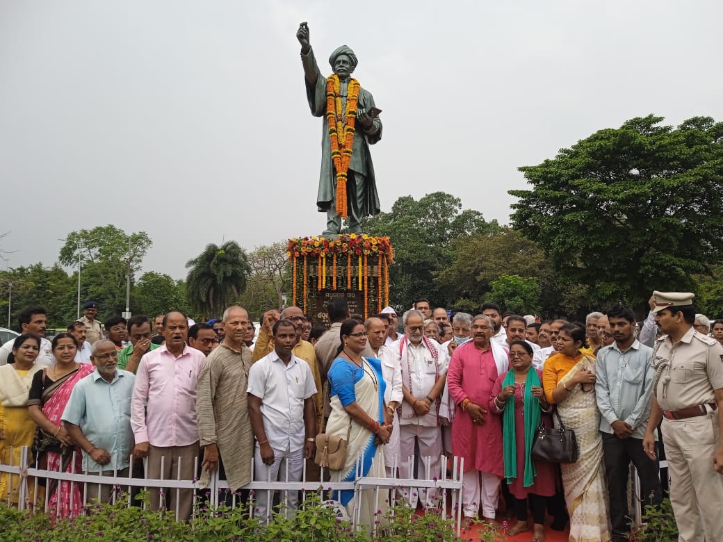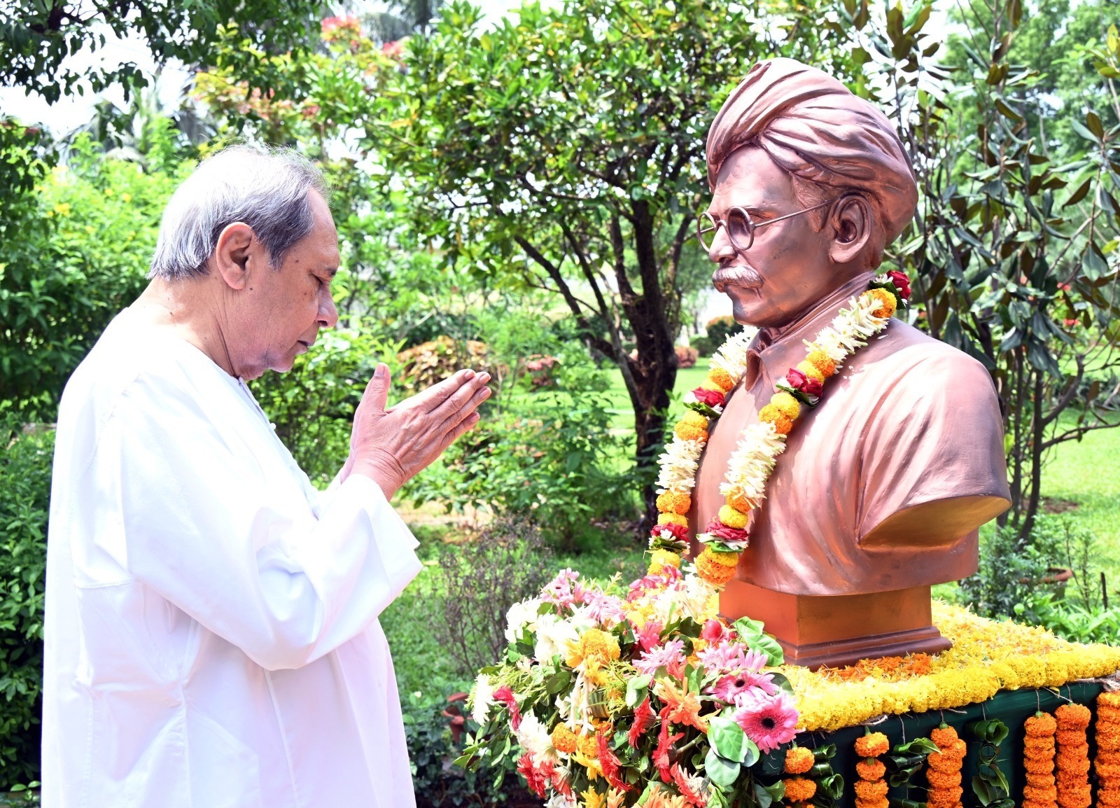 Chief Minister Naveen Patnaik garlands staue of Utkal Gouraba Madhusudan Das at Naveen Nivas in Bhubaneswar