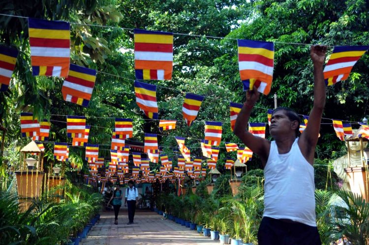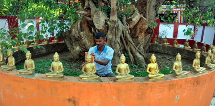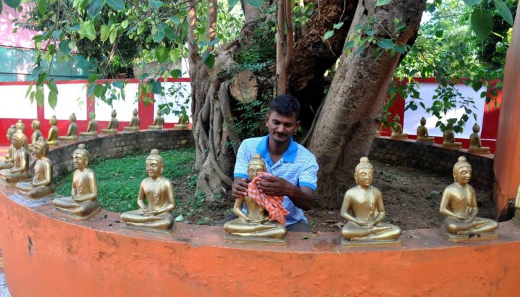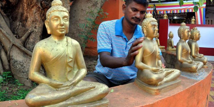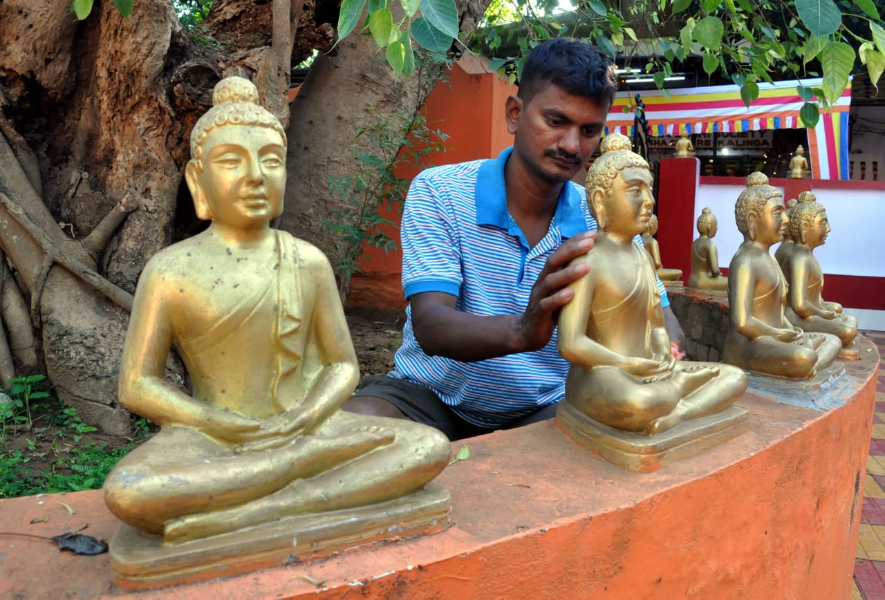A man cleans statues of Lord Buddha ahead of Buddha Jayanti