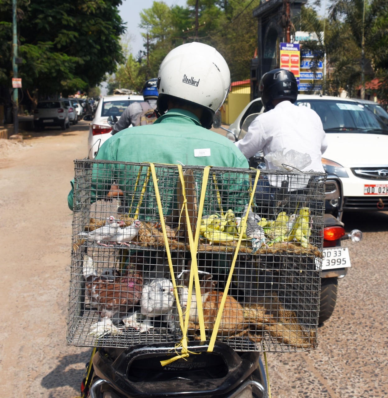 A bird seller transports birds in a cage on his scooter in Bhubaneswar