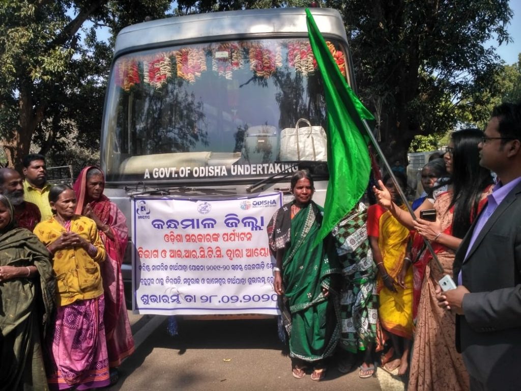 Kandhamal Collector Brunda D flags off a bus ready to carry a group of 53 senior citizens on a pilgrimage to Tirupati, Madurai and Rameswaram