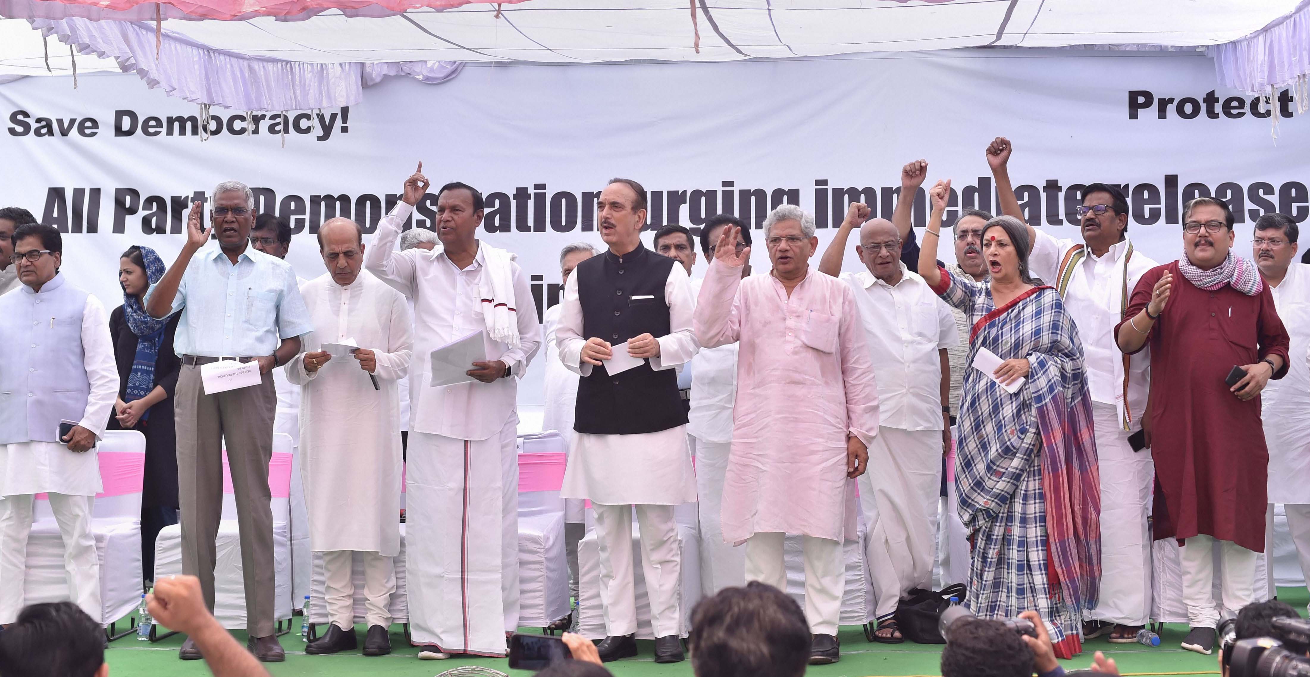 Congress leader Ghulam Nabi Azad, CPI(M) general secretary Sitaram Yechury, CPI general secretary D Raja, SP leader Ramgopal Yadav, Loktantrik Janata Dal’s Sharad Yadav, RJD’s Manoj Jha and TMC’s Dinesh Trivedi were among those who attended the protest.