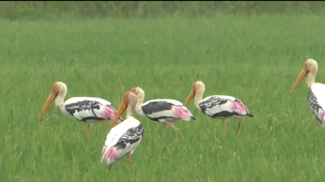 Following the recent Montha cyclone, large flocks of painted storks were spotted Monday near the Tanda forest, the fringes of the hental mangroves, and along the adjoining creeks. Known for their pink plumage and black-and-white tails, these birds feed on small fish, snails, crabs, and aquatic insects. They nest and rear their young within the mangrove cover, finding the area secure from human disturbance.