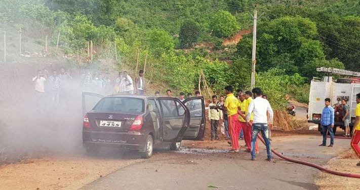 According to reports, B Amarnath, the owner of the car, along with his friends came to Rayagada town for sightseeing. The car suddenly caught fire due to a technical glitch when Amarnath and others were enjoying the natural scenery on the other side of the hanging bridge. They immediately alerted the fire brigade.