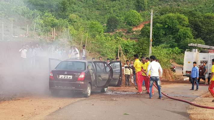 According to reports, B Amarnath, the owner of the car, along with his friends came to Rayagada town for sightseeing. The car suddenly caught fire due to a technical glitch when Amarnath and others were enjoying the natural scenery on the other side of the hanging bridge. They immediately alerted the fire brigade.
